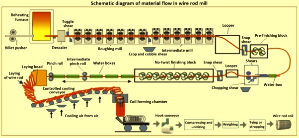 The product range of these mills usually consists of those shaped and sectional products whose cross-section is smaller than the cross section of the products rolled in medium and heavy section rolling mills. Wire rod mills produces steel wire rods of diameters 5 mm to 12.5 mm in coil form with the weight of the coil upto 2.5 tons. The qualities of steels being rolled in these mills can range from low carbon, mild steel, medium carbon, high carbon, and micro and low alloyed steels.